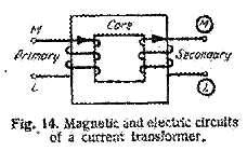 Why Current Transformers are Used. — A current transformer is an instrument transformer for the transformation of current from one value to another, usually a lower one, or for the transformation of current at a high voltage into a proportionate current at a low voltage with respect to earth potential. Current transformers are used in conjunction with alternating-current meters or instruments where the current to be measured is of such magnitude that the meter or instrument current coil cannot conveniently be made' of sufficient carrying capacity. They are also used wherever high-voltage current has to be metered, because of the difficulty of providing adequate insulation in the meter- itself. In this connection-supply voltages exceeding 660 volts are considered to be high voltage. In meter practice current transformers are used wherever the current to be metered exceeds 100 amperes, and in some instances a lower value than this is regarded as the desirable maximum for direct measurement. Construction of Current Transformers. — A current transformer comprises a magnetic circuit, usually in the form of iron stampings assembled together to form a core, on which are wound two electric circuits called the primary winding and secondary winding respectively. The primary winding carries the current to be measured and is connected in the main circuit. The secondary winding carries a current proportional to the current to be measured and the secondary terminals are connected to the current winding of the meter or instrument. Both windings are insulated from the core and from each other. The secondary insulation is arranged to withstand a test pressure of 2,000 volts applied between the winding and the core for one minute. The insulation of the primary is arranged to withstand for one minute a test pressure applied between the primary and secondary windings approximately equal to four times the voltage existing under working conditions. During this test the core and the secondary winding are connected together. The primary circuit of a current transformer may consist of a single conductor in the form of a bar or cable instead of a winding, when the current to be measured is of the order of 600 amperes or more. In low-voltage circuits the current to be measured may be so heavy that it is not convenient to provide a primary integral with the transformer and the latter then consists of an iron core of appropriate shape with a secondary winding thereon, the whole being mounted on the busbar or cable. The nominal full-load current of a transformer is termed the "rated primary current" and is the value in amperes of the primary current marked on the rating plate. The secondary winding of a current transformer is usually constructed to deliver five amperes to the meter or instrument ' when rated primary current flows in the main circuit. This is referred to as the "rated secondary current" and five amperes is the standard value adopted in most countries. In power-station practice it is not unusual for the meter to be separated from its current transformers by a distance of several hundred feet. The PR loss in the connecting leads together with the loss in the meter current coils may impose a burden in excess of the transformer rating if a five-ampere secondary current is adhered to. By adopting a lower value for the rated secondary current the loss in the leads can be substantially reduced and one ampere or 0.5 ampere values are permissible alternatives. Since the loss varies as the square of the current the adoption of one of these alternatives will reduce the loss in the leads to one-twenty-fifth or one-hundredth of the original value respectively.