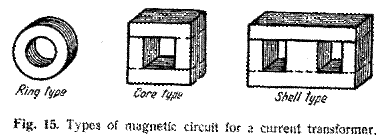The cores of current transformers are usually built up with laminations of silicon-steel but where a high degree of accuracy is desired a high-permeability nickel-steel such as Mumetal or Permalloy may be used. Three types of magnetic circuit are in common use, namely, "ring-type", "core-type" and "shell-type" and are illustrated in Fig. 15.