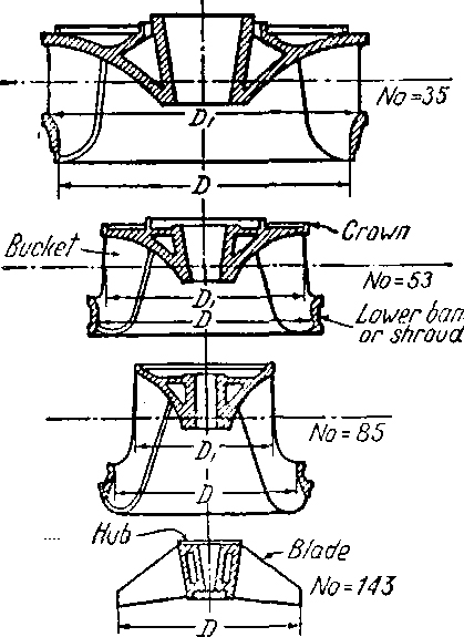 A comparison of various types of reaction runners of the same power, but of different specific speeds, is shown in fig. 3. The top three sections show Francistype runners and the bottom section a propeller-type runner. As the specific speed is increased, the figure indicates that the flow through the runner changes from radially inward to more nearly axial. Roughly the propeller runner may be considered as a development of the Francis type in which the number of blades is greatly reduced and the lower band omitted. Strictly, however, the process of flow of water from the guide case to and through a propeller is quite different because of the large space, called the whirl chamber, between the stationary guide case and the entrance into the propeller runner. Francis runners having a specific speed of 20 to 100 may be constructed of cast iron, cast steel or bronze, or with cast-iron or cast-steel hubs and rims and plate-steel buckets. For heads above 250 ft., either bronze or cast-steel runners are recommended, as the tensile strength of ordinary cast iron is low and too great a thickness of section would be required. For low-head conditions the plate-steel buckets have been used successfully up to 75 ft. This construction greatly reduces the cost of building the runner, and it is entirely suitable for these conditions as the plate steel is an excellent metal for this purpose and by proper treatment a practically perfect bond can be made between the end of the blades and the cast-iron or caststeel hub. Plate-steel buckets, being thinner than cast buckets, allow more water to pass through the runner and, consequently, more power to be obtained for the same size of wheel. Propeller Runners. Inherently suitable for lowhead developments, the propeller-type unit has effected marked economies within the range of head to which it is adapted. The higher speed of this type of turbine results in a lower-cost generator and somewhat smaller powerhouse substructure and superstructure. Fixed-blade Type. The fixed-blade propeller-type unit has a high efficiency (88 % in this case) at a point near full load, but the efficiency drops off rapidly as the load decreases, until, at 40 % of full load, the efficiency is only about 50 %. The installation of the fixed-blade propeller-type runner should therefore be limited to developments where the units may be operated at a point near maximum efficiency or not at all, and where, under variable head, the load of the unit could be shifted to an output resulting in best efficiency. Materials. Propeller-type runners for low heads and small outputs are sometimes constructed of cast iron. For heads above 20 ft., they are made of cast steel, a much more reliable material. Large-diameter propellers may have individual blades fastened to the hub. Adjustable-blade Runners. The adjustable-blade propeller type is a development from the fixed-blade propeller wheel. One of the best-known units of this type is the Kaplan unit, in which the blades may be rotated to the most efficient angle by a hydraulic servomotor. A cam on the governor is used to cause the blade angle to change with the gate position so that high efficiency is always obtained at almost any percentage of full load. Earlier developments in the United States provided for a maximum adjustment of the blades with turbine at rest to compensate for changes in the head or limitations of discharge. As a step between the two, the so-called motormatic type, which permits a manual or electric adjustment while the unit remains in operation, is used in the United States. Selection of Type of Turbine. The problem confronting the engineer is to determine the type and setting that will result in the most economical development under the given existing conditions. Each type of turbine has its limitations in application. The impulse wheel is, in general, used for very high heads, above 800 ft., although, in special cases where it is used to drive plant service equipment requiring small horsepower capacity, this type of wheel is used at heads much lower than 800 ft. By reason of its lower costs of parts exposed to natural wear and tear it may be preferred to other types in cases where there is an excess of water. The Francis type can be efficiently and economically employed at heads ranging from 50 to 800 ft. One installation has been in operation for several years under a head of 960 ft. Under such high heads the unit should be operated near best point of efficiency (head) so as to avoid excessive hydraulic wear, especially at low part load. Operating water free of sand and chemicals is indispensable. There are still many plants installed long before the development of the propeller type for heads down to 8 ft. for direct coupling to generators, or for even lower heads, employing bevel gears or belt, or rope drives, to higher-speed generators or transmission-line shafts. The propeller type is generally used for low-head developments of heads from 10 to 80 ft., but units of this type have been used under heads somewhat exceeding 100 ft. Other factors affecting selection of a propeller type as against the Francis type are: The propeller has a higher runaway speed, thus involving a correspondingly more expensive design of generator. The hydraulic thrust is higher, requiring a more costly thrust bearing. With increasing head the suitable specific speed becomes lower. For instance, for heads greater than 100 ft. it is below 90. This brings it nearer to a Francis turbine speed so that the over-all cost of a propeller turbine and generator combined as compared with that of a Francis turbine and generator combined may not offset the increased cost of excavation. On account of the long passageway from the end of guide vanes to runner vanes of a propeller, it cannot respond as promptly to a load change as can the Francis type, especially one of moderate specific speed. Therefore, a propeller unit requires a relatively larger WR2 of revolvin